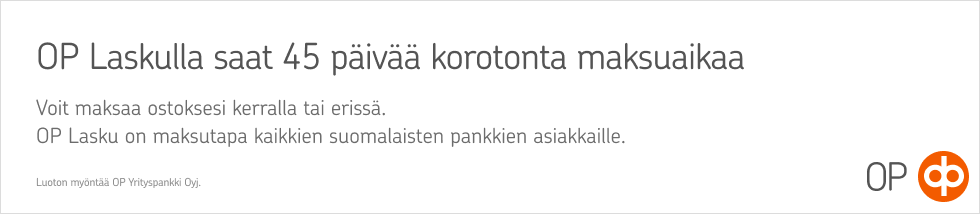 Suorita ostos normaalisti ja valitse kassalla OP-lasku – saat automaattisesti 45 päivän korottoman maksuaijan. Maksat ainoastaan pienen 2,90 € tilinhoitomaksun. OP-lasku vaihtoehdon löydät kauppamme maksupainikkeiden takaa. Helppoa, turvallista ja joustavaa!